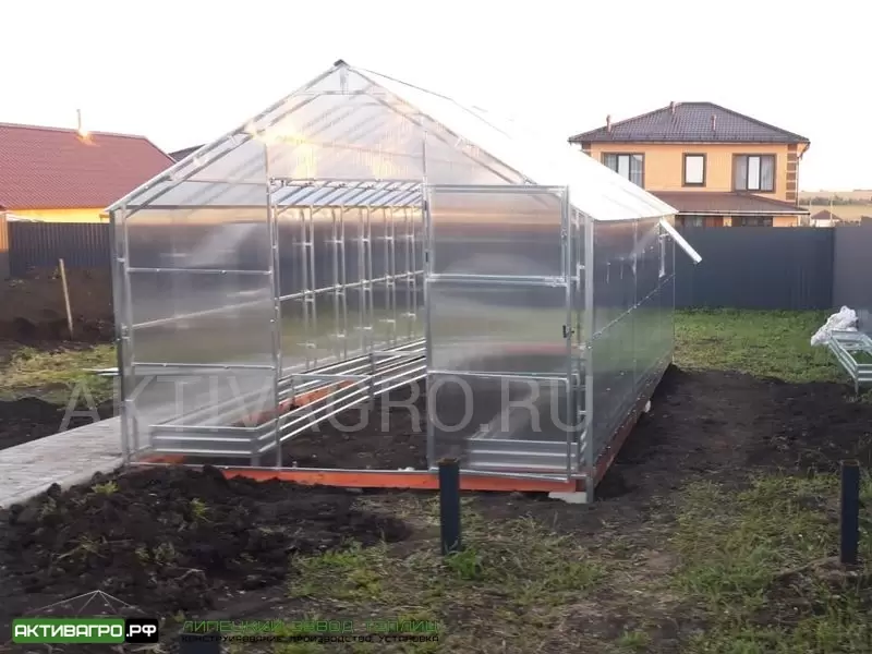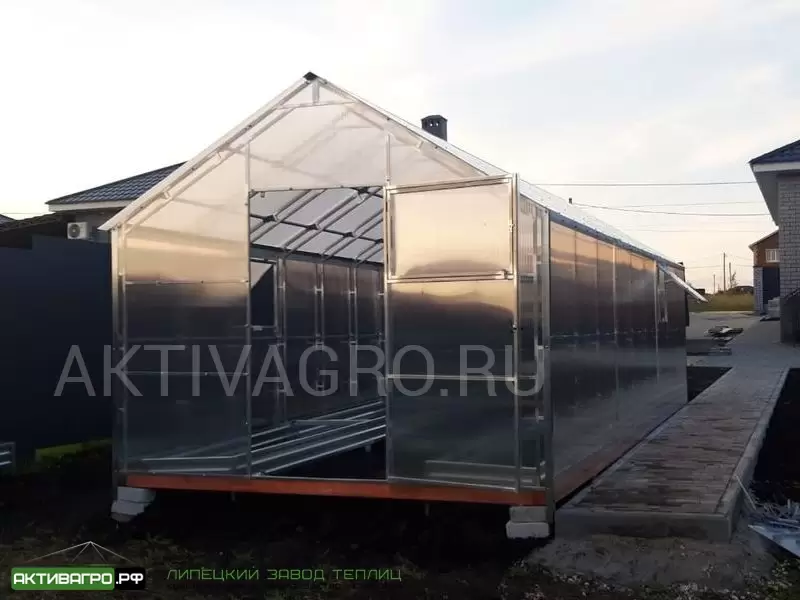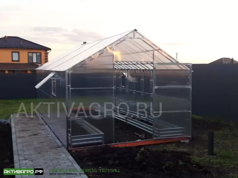 Завод «АКТИВАГРО» производит домики из светопрозрачного поликарбоната с двухскатными крышами. Для сбора урожая в сезон жители разных регионов страны могут купить на сайте со скидкой теплицу «Ударница Англичанка» с сертификатом соответствия. Каркас шириной 2.5/3 м и высотой скатов 2,25 м изготовлен из двойной трубы сечением 20х20 + 20х20 мм с двухсторонней оцинковкой.